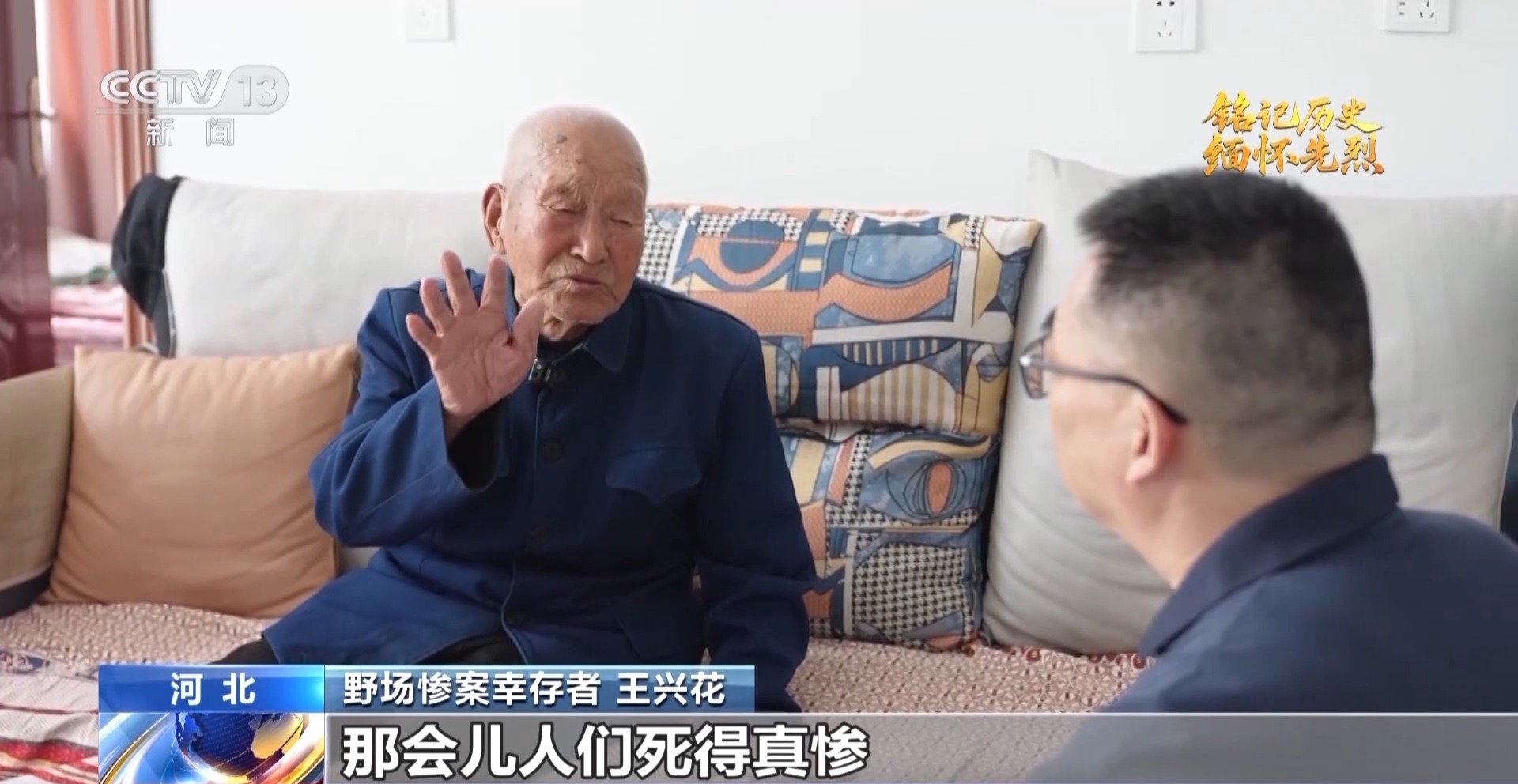 野場慘案幸存者 王興花:那會兒人們死得真慘。日軍頭一次問,八路軍東西在哪兒,都說不知道,第二次還問還是這一套,第三次日軍說,說了你們就能活,要不說統(tǒng)統(tǒng)開槍滅掉你們,王璞站起來說不知道,大家伙一致說不知道。