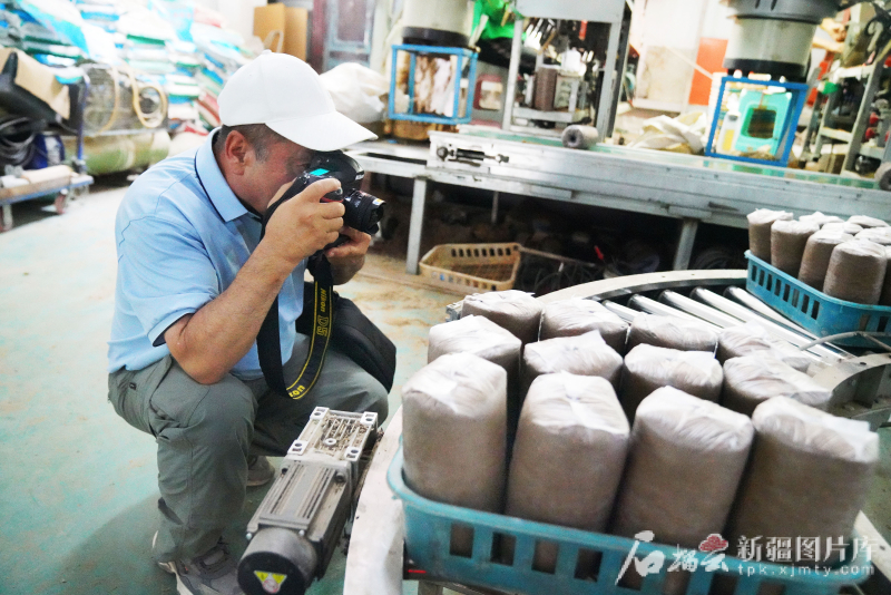 6月30日,在疏勒縣“魯疆情”食用菌生態(tài)科技示范園里,攝影記者約提克爾·尼加提在生產(chǎn)車間拍攝。