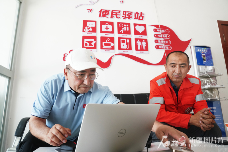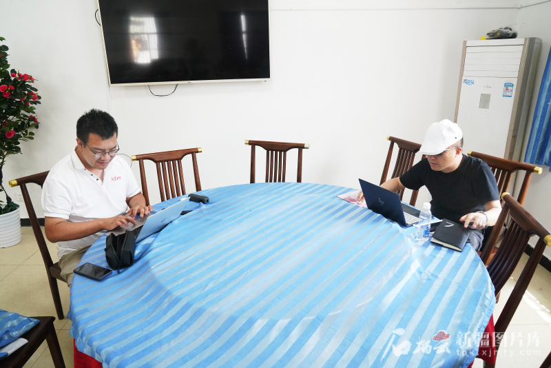 7月1日,在喀什公路事業(yè)發(fā)展中心疏附養(yǎng)護所蓋孜養(yǎng)護站,記者馬晉軒(左)和王永飛利用午餐時間準備稿件。