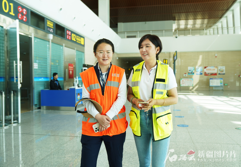 7月4日,記者加孜拉·泥斯拜克(右)在采訪塔什庫爾干紅其拉甫機場開通后的變化。
