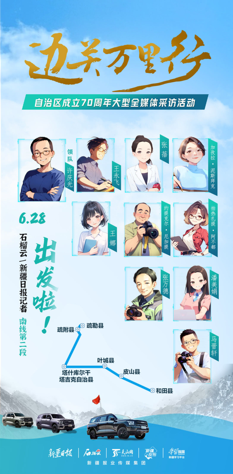 從6月29日開始,“邊關萬里行——自治區(qū)成立70周年大型全媒體采訪活動”南線采訪團隊先后前往喀什市、疏附縣、疏勒縣、伽師縣、塔什庫爾干塔吉克自治縣、葉城縣等地進行采訪。從喀什古城到農(nóng)家小院,從城區(qū)到工業(yè)園區(qū),從邊境派出所到紅其拉甫國門……記者們一直在路上記錄70年來的發(fā)展變遷。