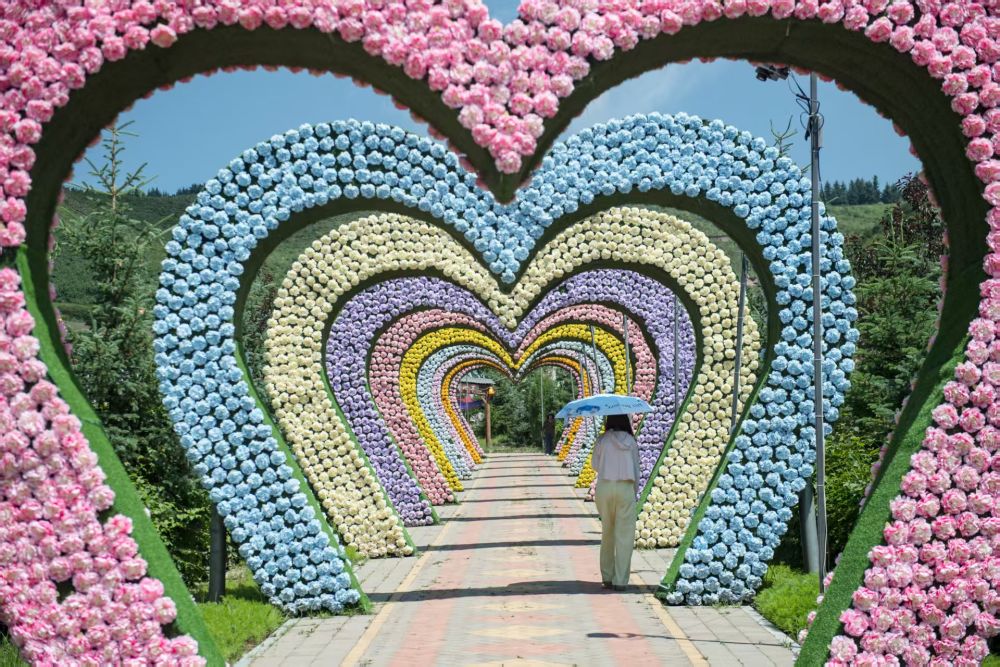 7月22日,在青海省大通縣邊麻溝花海景區(qū),一名游客經(jīng)過鮮花長廊。新華社記者 孫瑞博 攝