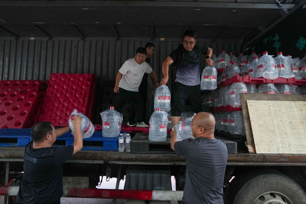 7月27日,在北京市密云區(qū)石城鎮(zhèn)中心小學(xué)安置點,工作人員在卸物資。新華社記者 鞠煥宗 攝