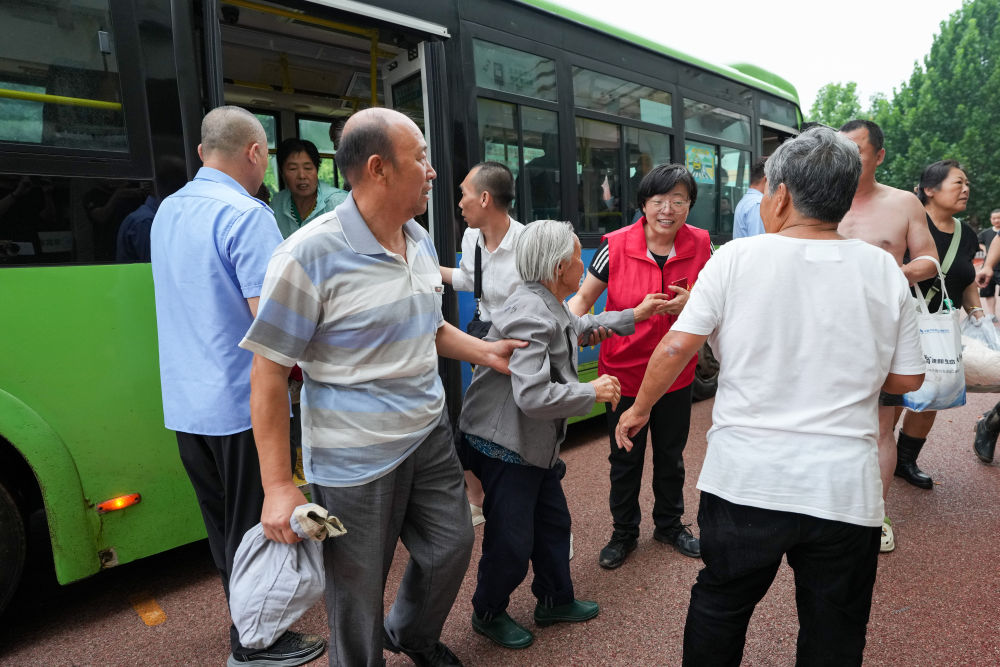 7月27日,在北京市密云區(qū)石城鎮(zhèn)中心小學(xué)安置點,受災(zāi)群眾乘坐大巴轉(zhuǎn)運車抵達(dá)安置點。新華社記者 鞠煥宗 攝