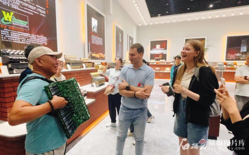 在塔城市民間手風(fēng)琴藝人谷英福的伴奏下,留學(xué)生們聞聲起舞歡唱,《喀秋莎》《莫斯科郊外的晚上》《山楂樹》等一首首熟悉的旋律響起,前來參觀的游客們也加入了大合唱,熱鬧的氛圍瞬間拉滿?!斑@里多民族和睦相處,可以感受到音樂已成為大家交往交流交融的橋梁,呈現(xiàn)出了文化的豐富多樣性,這感覺很美妙?!眮碜远砹_斯的留學(xué)生妮拉有感而發(fā)。