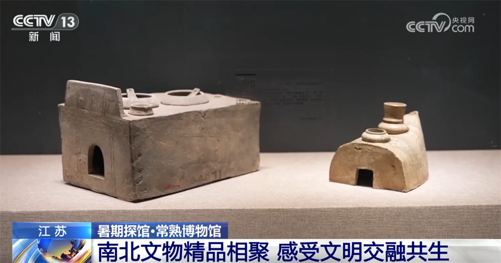 再來看這兩件展品,它們都是灰陶灶,是明器的一種,而且都是一孔灶,但是出土于北方和南方的灰陶灶明顯在風(fēng)格上是不一樣的,北方的更為方正,而南方的這個船型灶也是屬于江南地區(qū)特有的灰陶灶。