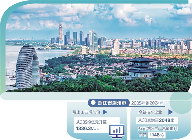 數(shù)據(jù)顯示,2005年到2024年,湖州規(guī)上工業(yè)增加值從239.9億元升至1336.3億元,高新技術(shù)企業(yè)從30家增至2048家,萬元地區(qū)生產(chǎn)總值能耗下降約48%。