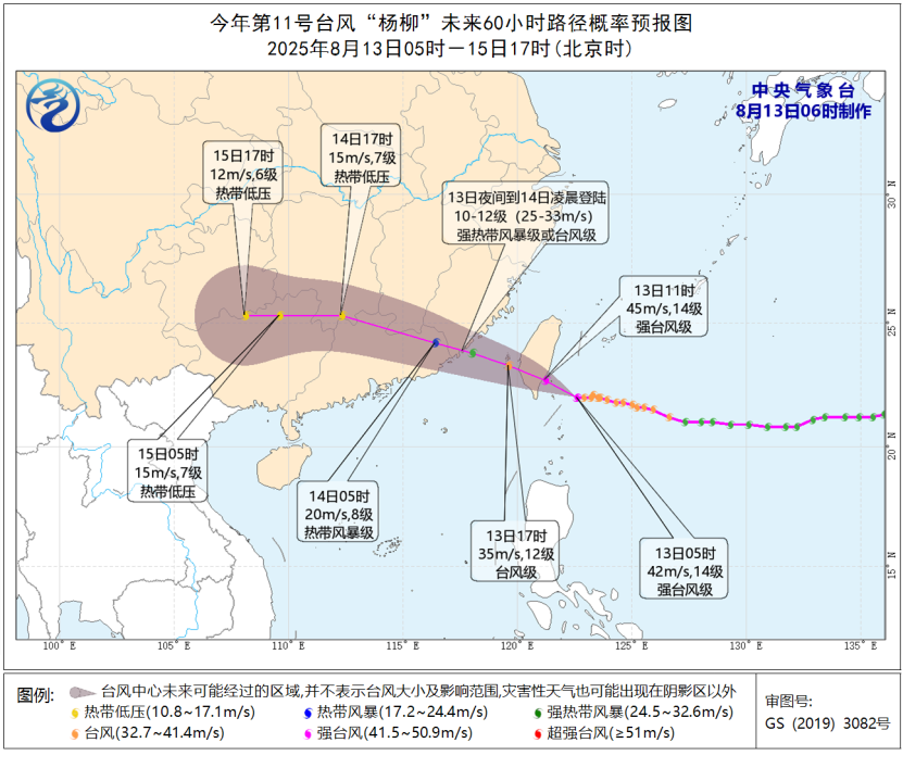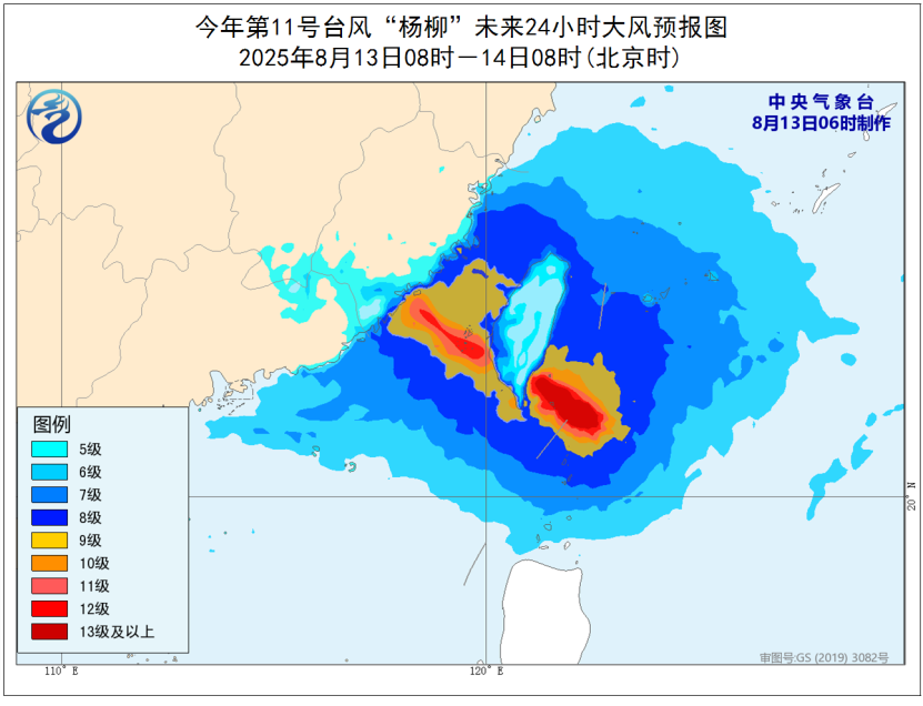 大風(fēng)預(yù)報(bào):8月13日08時(shí)至14日08時(shí),東海南部、臺(tái)灣以東洋面、南海東北部、巴士海峽、臺(tái)灣海峽、臺(tái)灣島北部及其沿海、福建北部沿海、廣東中東部沿海將有6~8級(jí)大風(fēng),臺(tái)灣島南部及其沿海、福建中南部沿海、臺(tái)灣東南洋面、臺(tái)灣海峽和巴士海峽的部分海域風(fēng)力可達(dá)9~10級(jí),臺(tái)風(fēng)中心經(jīng)過的附近海域和地區(qū)風(fēng)力有11~14級(jí),陣風(fēng)15-16級(jí)。