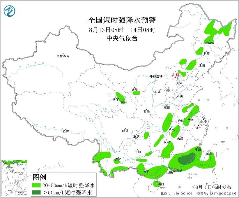 預(yù)計(jì)8月13日08時(shí)至14日08時(shí),內(nèi)蒙古東南部、東北地區(qū)北部和西部、蘇皖北部、華南東部等地的部分地區(qū)將有8級(jí)以上雷暴大風(fēng)或冰雹天氣,其中,黑龍江東北部、遼寧西部、福建南部、廣東東部等地的部分地區(qū)將有10級(jí)以上雷暴大風(fēng),最大風(fēng)力可達(dá)11級(jí)以上;內(nèi)蒙古東南部、東北地區(qū)北部和西部、江淮西部和北部、江漢、江南北部和西部、西南地區(qū)東部和南部、華南等地的部分地區(qū)將有小時(shí)雨量大于20毫米的短時(shí)強(qiáng)降水天氣,其中,福建南部、廣東東部等地的部分地區(qū)小時(shí)雨量大于50毫米,最大可達(dá)70毫米以上。