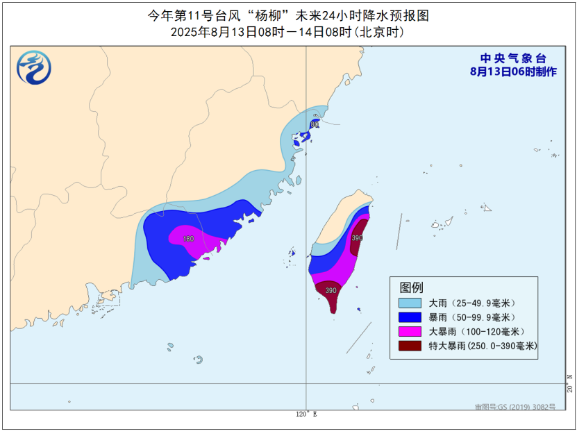 降水預(yù)報(bào):8月13日08時(shí)至14日08時(shí),廣東東部、福建東部和南部、臺(tái)灣島大部等地有大到暴雨,其中,福建東南部、廣東東南部、臺(tái)灣島東部和南部等地有大暴雨,臺(tái)灣島東部和南部的局地特大暴雨(250~390毫米)。