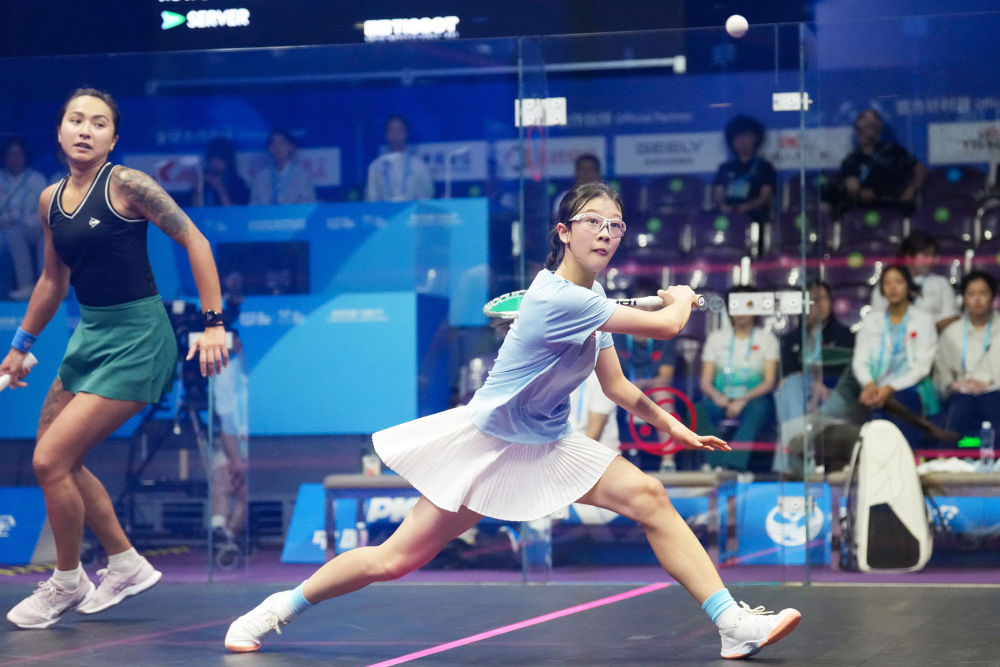 8月9日,中國選手殷子媛(右)在壁球女子單打16強遺材賽中擊球。新華社記者 李旭倫 攝