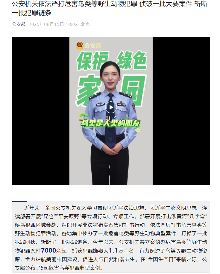近年來,全國公安機(jī)關(guān)深入學(xué)習(xí)貫徹習(xí)近平法治思想、習(xí)近平生態(tài)文明思想,連續(xù)部署開展“昆侖”“平安原野”等專項(xiàng)行動、專項(xiàng)工作,部署開展打擊涉黃河“幾字彎”候鳥犯罪區(qū)域會戰(zhàn),組織開展非法狩獵專案集群打擊行動,依法嚴(yán)厲打擊危害鳥類等野生動物犯罪活動。各地集中偵辦了一批危害鳥類等野生動物典型案件,打掉了一批犯罪團(tuán)伙、斬?cái)嗔艘慌缸镦湕l。今年以來,公安機(jī)關(guān)共立案偵辦危害鳥類等野生動物犯罪案件7000余起,抓獲犯罪嫌疑人1.1萬余名,有力保護(hù)了鳥類等野生動物資源,全力護(hù)航美麗中國建設(shè),促進(jìn)人與自然和諧共生。在“全國生態(tài)日”來臨之際,公安部公布了5起危害鳥類犯罪典型案例。