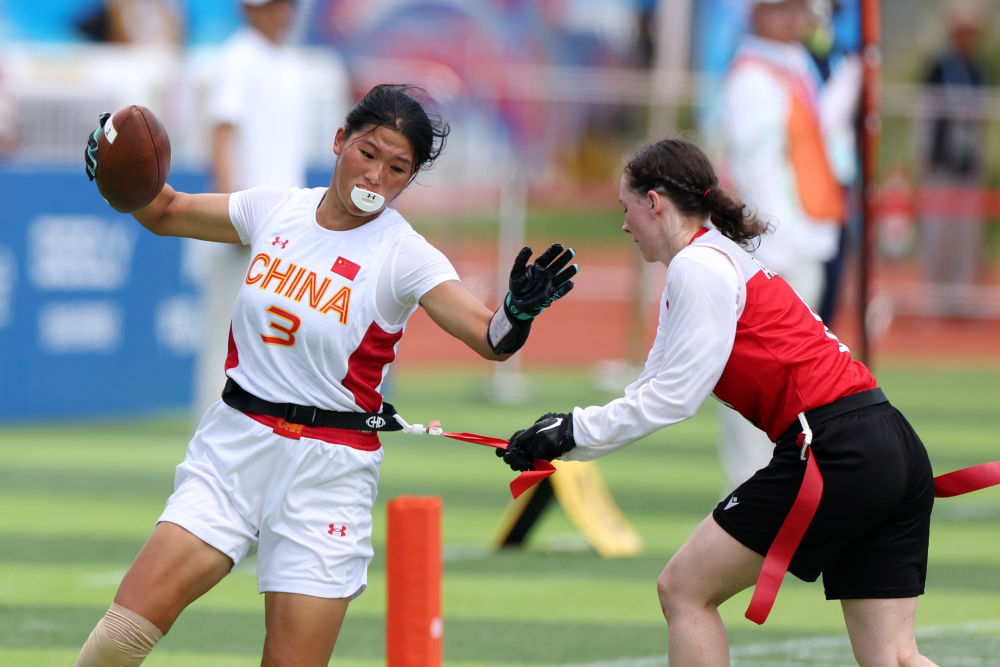 14日,腰旗橄欖球項(xiàng)目開賽。賽場(chǎng)上的激烈比拼與觀眾席上的“雄起”吶喊讓體育場(chǎng)“燃”起來(lái)。