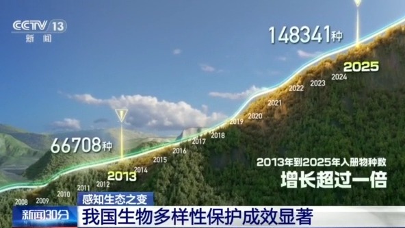 如今,《中國生物物種名錄》上“入冊(cè)”的生物種數(shù),從2013年的6.7萬種,增長到2025年的14.8萬種,增長超過1倍。近500種野生動(dòng)植物的受威脅等級(jí)出現(xiàn)下降。