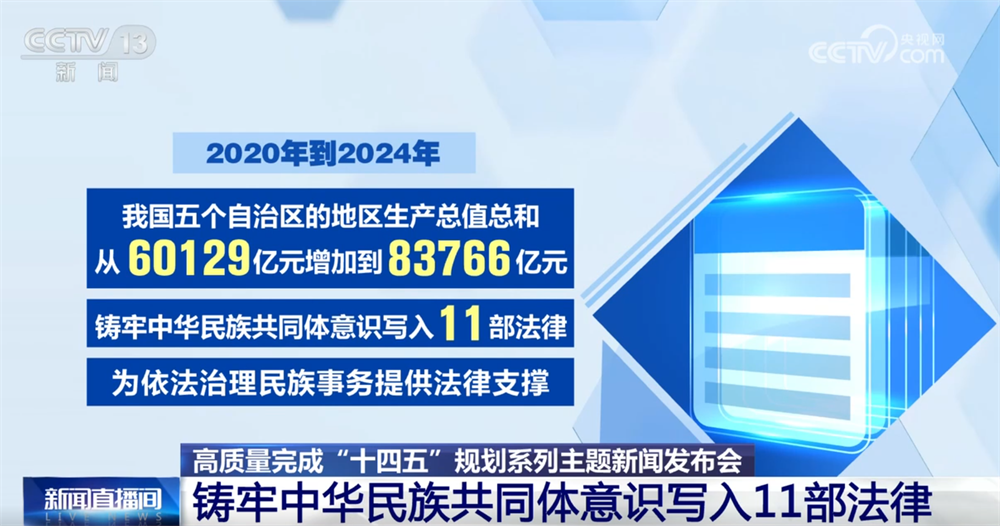 據(jù)了解,2020年到2024年,我國(guó)五個(gè)自治區(qū)的地區(qū)生產(chǎn)總值總和從60129億元增加到83766億元。鑄牢中華民族共同體意識(shí)寫(xiě)入11部法律,為依法治理民族事務(wù)提供法律支撐。