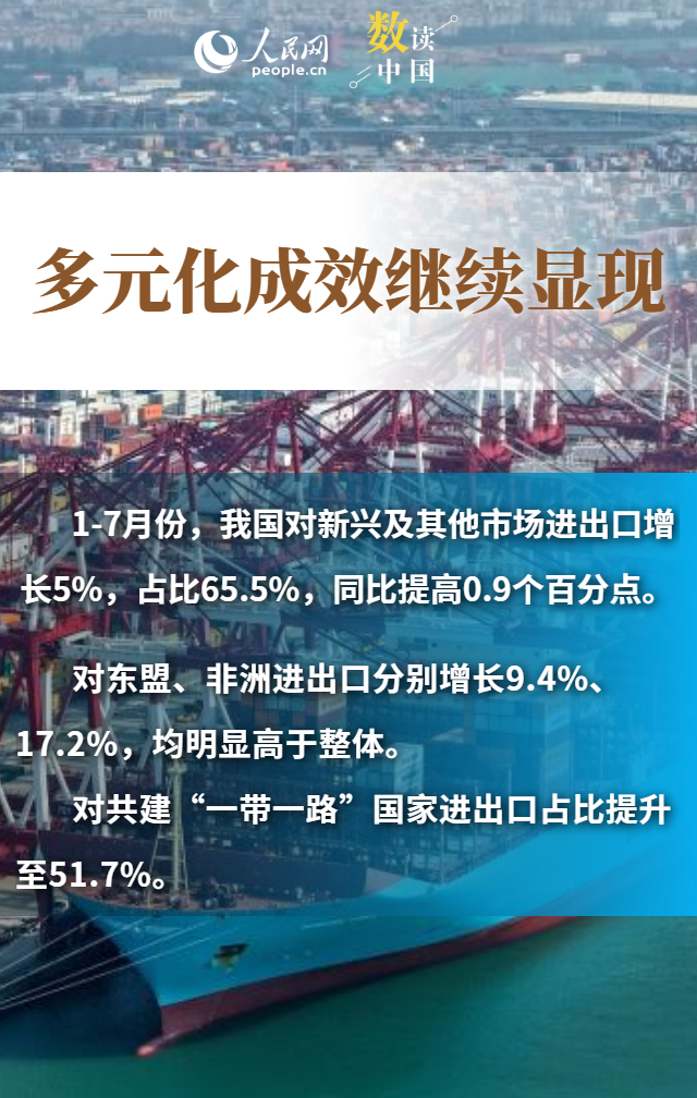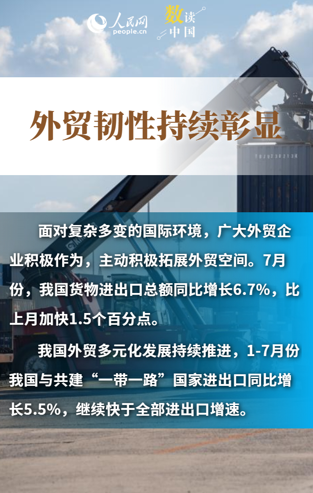 進(jìn)出口規(guī)模創(chuàng)歷史新高、“朋友圈”不斷擴(kuò)大、民營企業(yè)持續(xù)創(chuàng)新……數(shù)據(jù)顯示,今年前7個月,我國貨物貿(mào)易進(jìn)出口總值25.7萬億元,同比增長3.5%。在外部挑戰(zhàn)之下,我國貨物進(jìn)出口持續(xù)增長,展現(xiàn)出較強(qiáng)韌性和活力,為世界經(jīng)濟(jì)復(fù)蘇注入了中國力量。