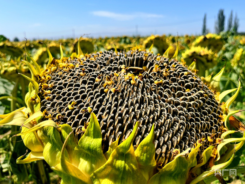 在這片萬畝連片種植區(qū),種植戶王多寶正帶領(lǐng)工人切割葵盤、插桿晾曬?!敖衲晏鞖夂?,葵花長勢特別旺,籽粒又大又亮,產(chǎn)量肯定差不了。”盡管汗水浸濕衣衫,喜悅卻洋溢在他的臉龐。