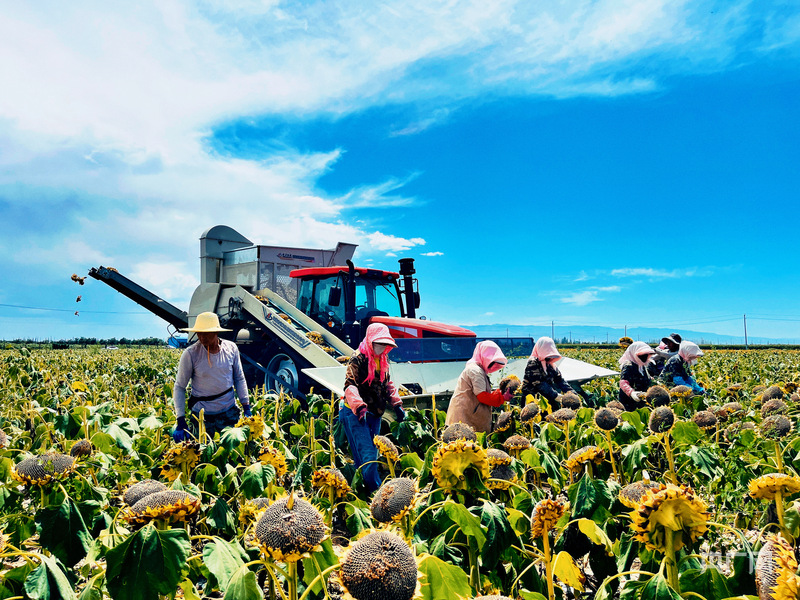 藍天白云下,農(nóng)民們與農(nóng)機協(xié)同,在向日葵田忙碌收獲(央廣網(wǎng)發(fā) 馬曉甜 攝)