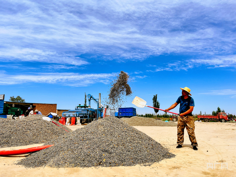 農(nóng)民在藍天下奮力鏟揚作物,豐收的喜悅在堆場彌漫(央廣網(wǎng)發(fā) 徐曉瑤 攝)