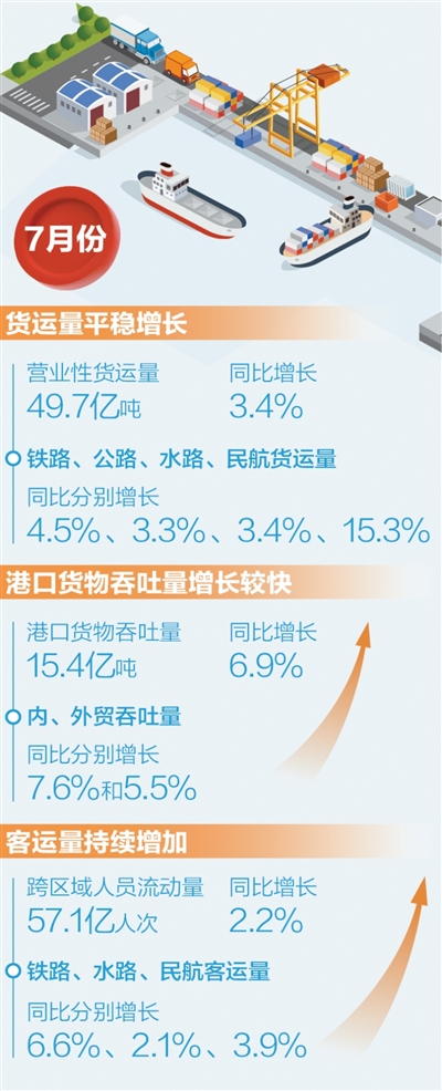 貨運(yùn)量保持平穩(wěn)增長(zhǎng)。7月份,完成營(yíng)業(yè)性貨運(yùn)量49.7億噸,同比增長(zhǎng)3.4%,增速較上月回升0.5個(gè)百分點(diǎn)。分方式看,鐵路、公路、水路、民航貨運(yùn)量同比分別增長(zhǎng)4.5%、3.3%、3.4%、15.3%。1至7月,完成營(yíng)業(yè)性貨運(yùn)量330億噸,同比增長(zhǎng)3.8%。