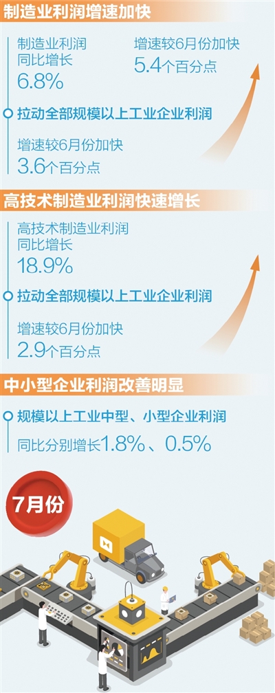 高技術(shù)制造業(yè)利潤(rùn)快速增長(zhǎng),引領(lǐng)作用明顯。7月份,高技術(shù)制造業(yè)利潤(rùn)由6月份下降0.9%轉(zhuǎn)為增長(zhǎng)18.9%,拉動(dòng)全部規(guī)模以上工業(yè)企業(yè)利潤(rùn)增速較6月份加快2.9個(gè)百分點(diǎn),引領(lǐng)作用明顯。其中,航空航天器及設(shè)備制造行業(yè)利潤(rùn)增長(zhǎng)40.9%,生物藥品制造、化學(xué)藥品制劑制造等行業(yè)利潤(rùn)分別增長(zhǎng)36.3%、6.9%。