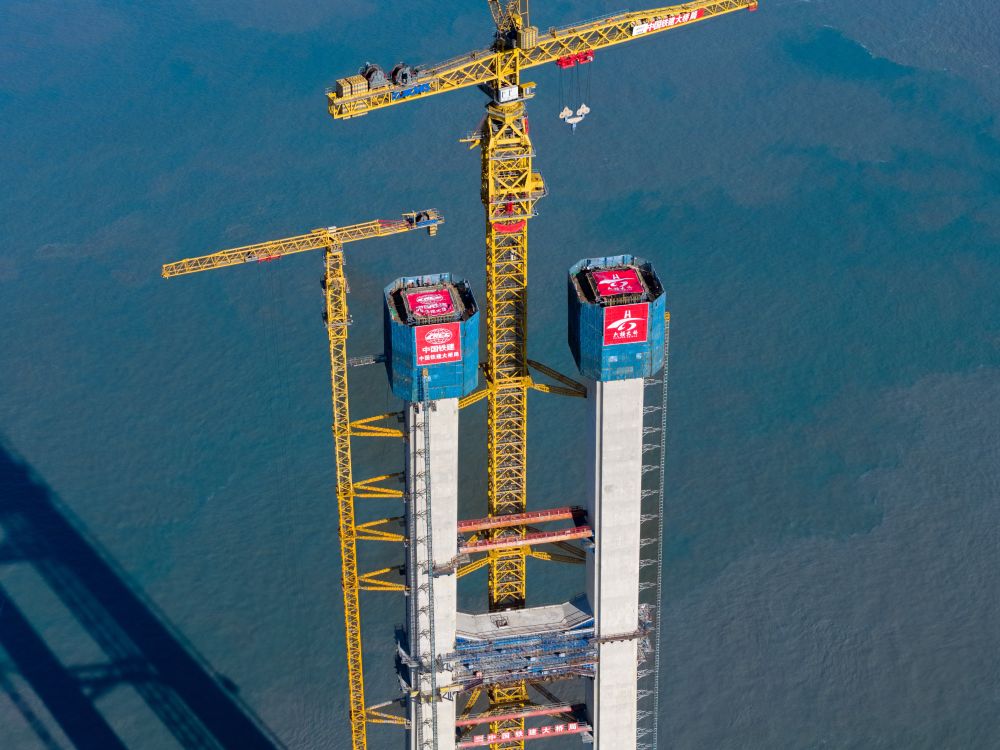 圖為雙嶼門特大橋首個(gè)主塔封頂施工現(xiàn)場。(中國鐵建大橋局供圖)