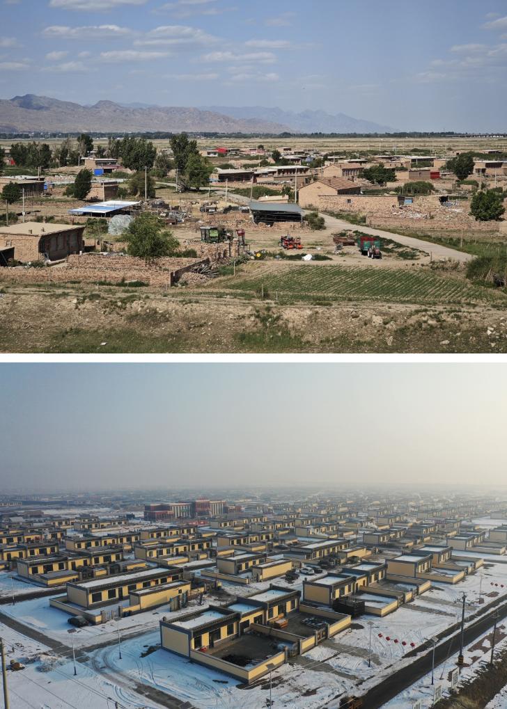 拼版照片:上圖為2023年6月8日拍攝的田家圪旦村拆除前村貌(新華社記者賈立君攝);下圖為2024年2月7日拍攝的田家圪旦新村村貌(無人機照片,新華社記者李志鵬攝)。新華社發(fā)