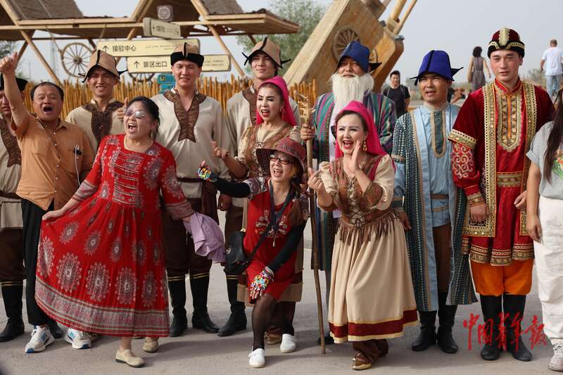 9月9日,新疆巴州尉犁縣羅布人村寨景區(qū),來自上海的游客在合影留念。2025年1月至8月,尉犁縣累計(jì)接待國內(nèi)游客313.6萬人次,同比增長23.55%,實(shí)現(xiàn)游客總花費(fèi)20.98億元,同比增長27.38%。中青報(bào)·中青網(wǎng)記者 王鑫昕/攝