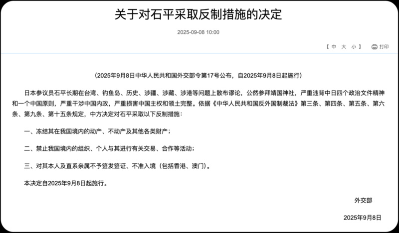 9月8日,中方宣布對(duì)日本參議員石平采取反制措施,禁止其進(jìn)入中國(guó)境內(nèi),凍結(jié)其在華資產(chǎn),并限制其與中國(guó)的商業(yè)往來(lái)。