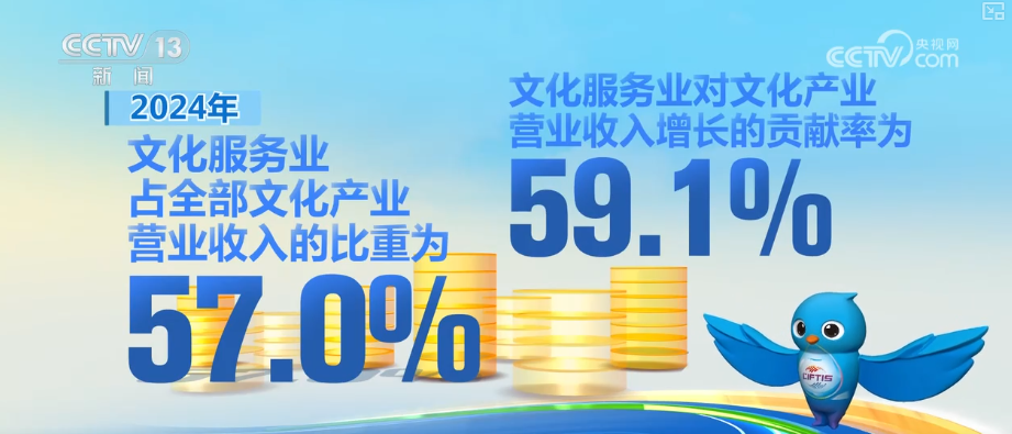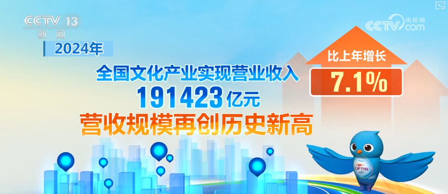 2024年,全國文化產(chǎn)業(yè)實現(xiàn)營業(yè)收入191423億元,營收規(guī)模再創(chuàng)歷史新高,比上年增長7.1%。2024年,文化服務(wù)業(yè)實現(xiàn)營業(yè)收入109134億元,比上年增長7.4%,占全部文化產(chǎn)業(yè)營業(yè)收入的比重為57.0%,文化服務(wù)業(yè)對文化產(chǎn)業(yè)營業(yè)收入增長的貢獻(xiàn)率為59.1%。
