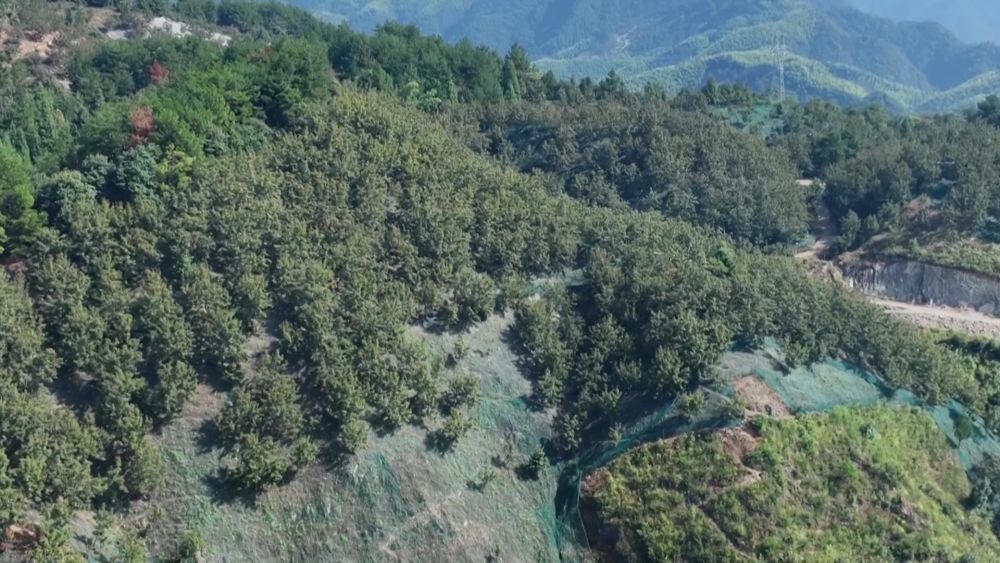 近年來,臨安區(qū)大力推廣張網采收,在昌化鎮(zhèn)白牛村西谷坪經濟林林場,一張張綠色的網像地毯一樣鋪滿山頭。