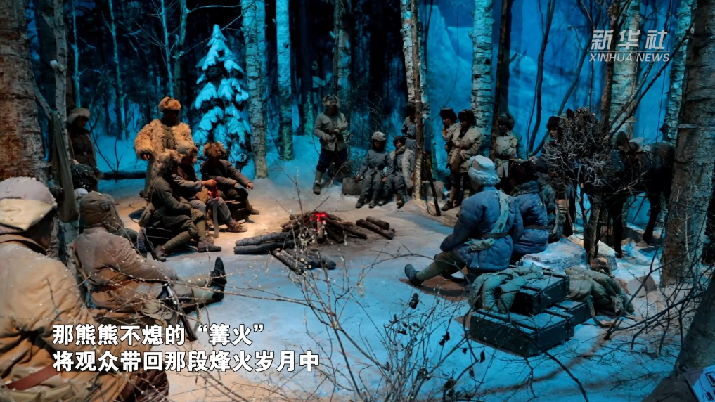 “九·一八”歷史博物館內,抗聯(lián)戰(zhàn)士密林宿營地的模擬場景吸引觀眾駐足,那熊熊不熄的“篝火”,將觀眾帶回那段烽火歲月中。