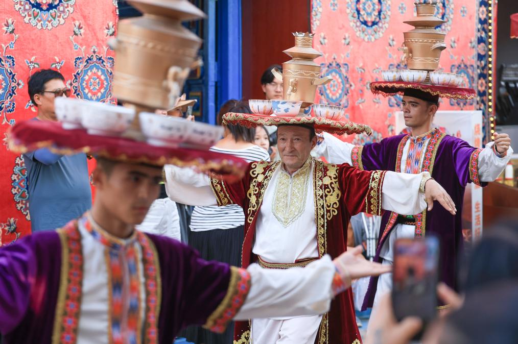 7月22日,在新疆庫車市的龜茲小巷,表演薩瑪瓦爾舞的演員參與當?shù)氐囊粓龌槎Y活動。新華社記者 王菲 攝
