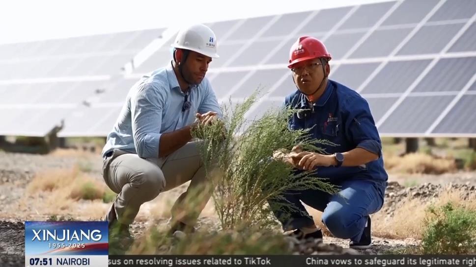 外籍主持人林肯探訪了全球最大的“草光互補(bǔ)”光伏基地——阿合雅光伏產(chǎn)業(yè)園。這片由181萬(wàn)塊光伏板組成的藍(lán)色海洋,占地493公頃,相當(dāng)于700個(gè)標(biāo)準(zhǔn)足球場(chǎng)。不僅能夠提供滿足約43萬(wàn)人全年用電需求,還兼具治沙功效。中國(guó)華能集團(tuán)烏什光伏電站負(fù)責(zé)人周博表示,這類光伏設(shè)施能夠穩(wěn)固土壤、防止侵蝕,板面凝結(jié)的水珠還可灌溉下方土地,支持植物持續(xù)生長(zhǎng)?!案瓯谄孥E”的背后,是國(guó)家實(shí)現(xiàn)“雙碳”目標(biāo)而推動(dòng)的生態(tài)與能源的“雙向奔赴”。