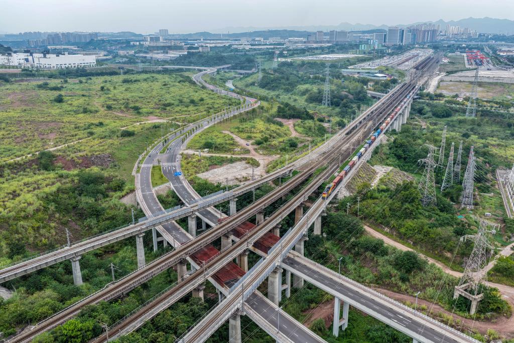 9月28日,西部陸海新通道班列在重慶魚(yú)嘴站順利發(fā)車(chē)(無(wú)人機(jī)照片)。新華社記者 唐奕 攝