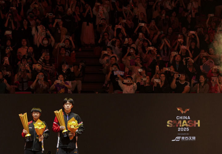 10月3日,在北京舉行的2025年世界乒乓球職業(yè)大聯(lián)盟(WTT)中國(guó)大滿貫賽混合雙打決賽后,冠軍中國(guó)組合王楚欽(右)/孫穎莎在頒獎(jiǎng)儀式上。新華社記者 鞠煥宗 攝