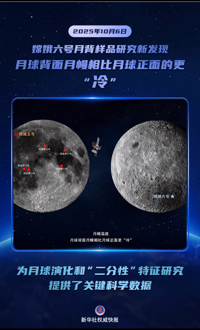 10月6日,時值中秋佳節(jié),國家航天局和國家原子能機(jī)構(gòu)聯(lián)合發(fā)布嫦娥六號月球背面樣品研究最新成果。我國科學(xué)家首次基于嫦娥六號月球背面樣品(月壤)研究發(fā)現(xiàn),月球背面月幔相比月球正面的更“冷”。
