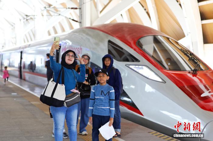 當(dāng)?shù)貢r(shí)間6月26日,旅客在印尼雅加達(dá)哈利姆高鐵站與列車合影。雅萬(wàn)高鐵由中印尼兩國(guó)合作建設(shè),最高運(yùn)營(yíng)時(shí)速350公里?!≈行律缬浾?李志全 攝