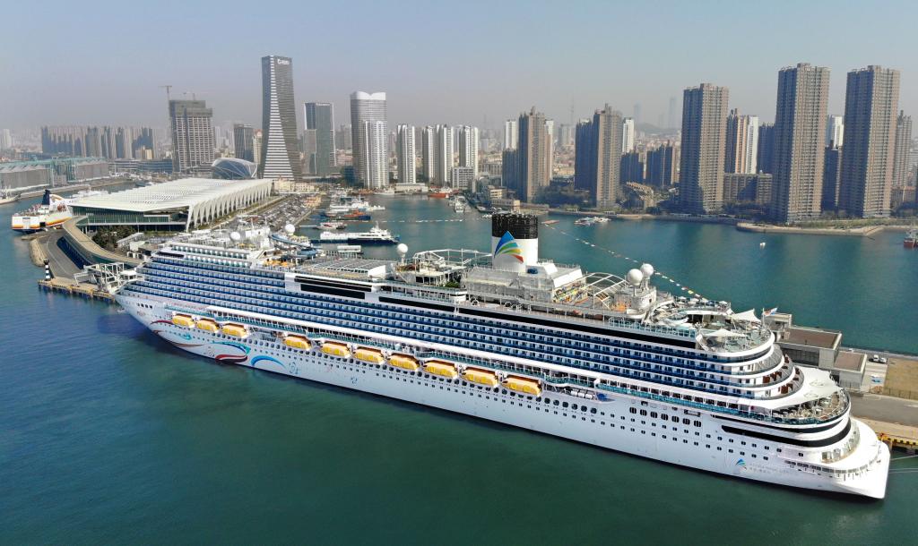 “愛達(dá)·魔都號(hào)”郵輪靠泊在青島郵輪母港碼頭(無人機(jī)照片)。新華社記者 李紫恒 攝
