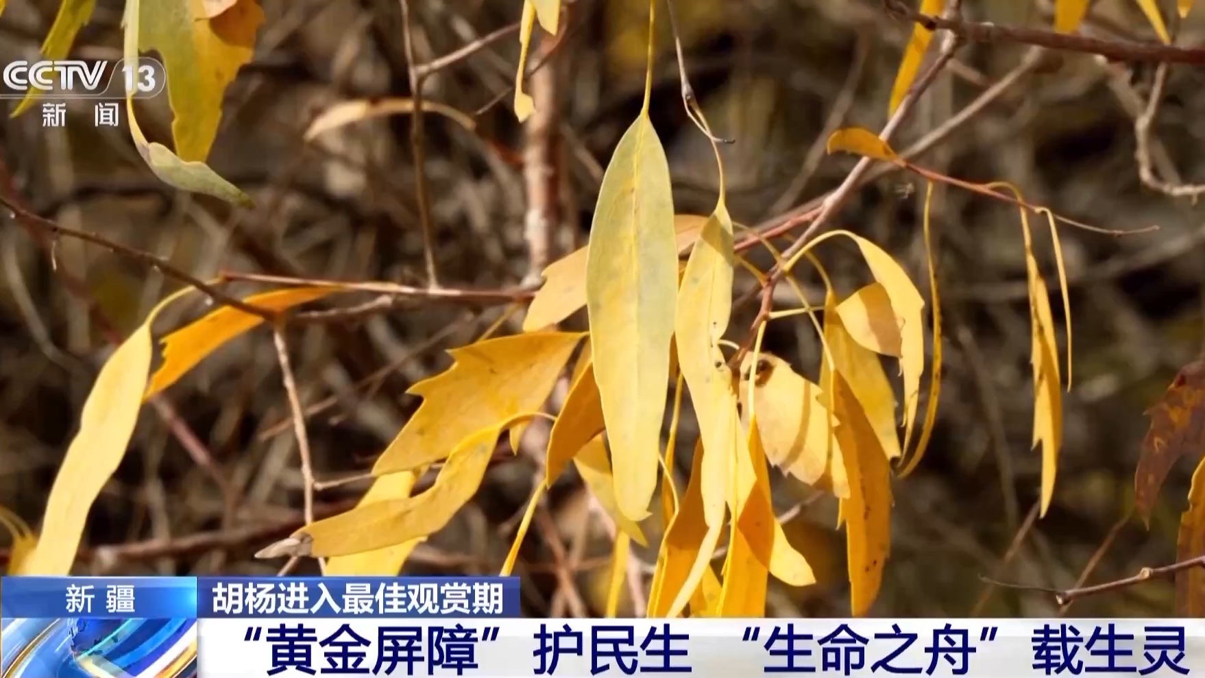 總臺記者 周宇:新疆沙雅縣擁有著全世界面積最大的野生胡楊林。這里的胡楊林進入了最佳的觀賞時期。當我們走近胡楊,會發(fā)現(xiàn)同一棵樹上擁有著不同形狀的葉子: