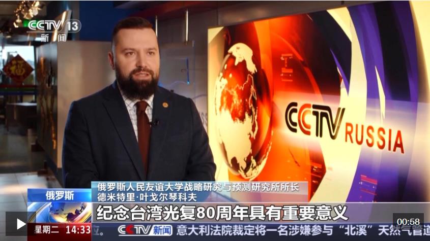 俄羅斯人民友誼大學(xué)戰(zhàn)略研究與預(yù)測(cè)研究所所長(zhǎng) 德米特里·葉戈?duì)柷倏品颍杭o(jì)念臺(tái)灣光復(fù)80周年具有重要意義,象征著中國人民心向統(tǒng)一。戰(zhàn)勝日本軍國主義是世界反法西斯戰(zhàn)爭(zhēng)的重要組成部分,這一歷史應(yīng)該被銘記。