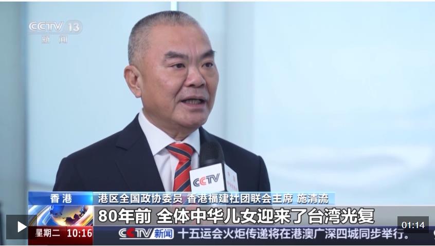 港區(qū)全國政協(xié)委員 香港福建社團聯(lián)會主席 施清流:80年前,全體中華兒女迎來臺灣光復,回歸祖國的歷史性時刻,這一偉大勝利值得兩岸同胞銘記。香港各界將銘記歷史,以實際行動推動兩岸交流合作,為助力國家發(fā)展大局貢獻力量,共創(chuàng)中華民族偉大復興的美好未來。