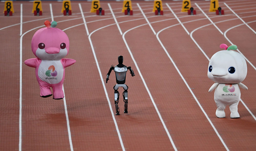 11月17日,在田徑項目賽事開始前的暖場活動中,機(jī)器人和吉祥物喜洋洋、樂融融在廣東奧體中心體育場賽跑。新華社記者 周牧 攝