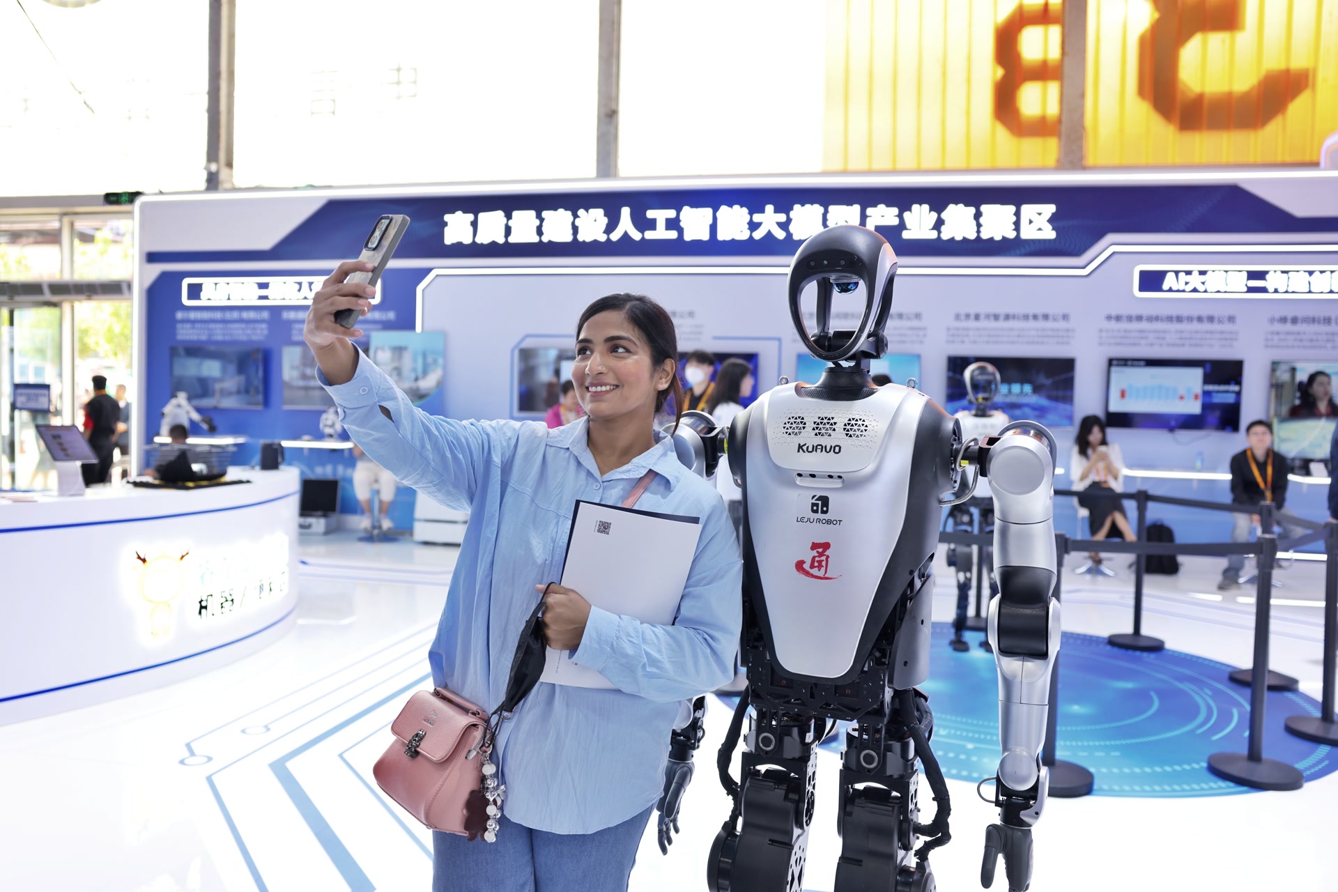 服貿(mào)會上,外國觀眾與機(jī)器人合影。 潘之望 攝