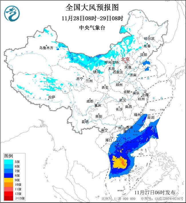 預(yù)計,11月27日08時至28日08時,新疆東部、內(nèi)蒙古中西部、甘肅西部、寧夏北部、山東半島、江蘇沿海以及青海西南部、西藏中西部等地有5~7級大風(fēng),陣風(fēng)8~9級,其中新疆東部山口地區(qū)、內(nèi)蒙古西部部分地區(qū)風(fēng)力可達(dá)8級,陣風(fēng)9~10級;11月27日08時至28日08時臺灣海峽、巴士海峽、南海北部和中東部海域?qū)⒂?級、陣風(fēng)9級的東北風(fēng),其中南海中西部和西南部海域的風(fēng)力可達(dá)10級、陣風(fēng)11級,南海中東部海域的風(fēng)力可達(dá)9級、陣風(fēng)10級,南海東南部海域?qū)⒂?級、陣風(fēng)9級的東南風(fēng)。