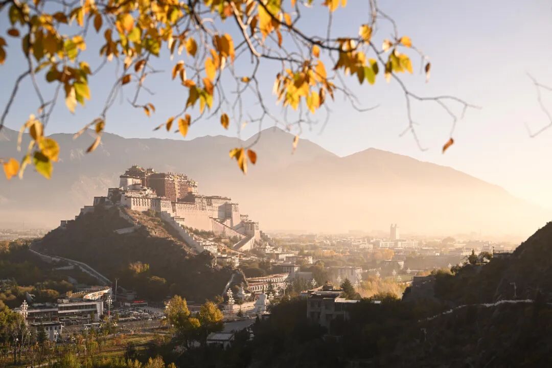 2025年10月22日清晨,薄霧尚未散盡,西藏拉薩團結(jié)公園的黃葉與布達拉宮相映成趣,勾勒出高原秋日的獨特畫卷。中新社記者 貢嘎來松 攝