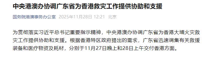 為貫徹落實習近平總書記重要指示精神,中央港澳辦協(xié)調廣東省為香港大埔火災救災工作提供協(xié)助和支援。根據香港特區(qū)政府提出的需求,廣東省迅速調集有關救援裝備和醫(yī)療物資及耗材,分別于11月27日晚上和28日上午交付香港方面。