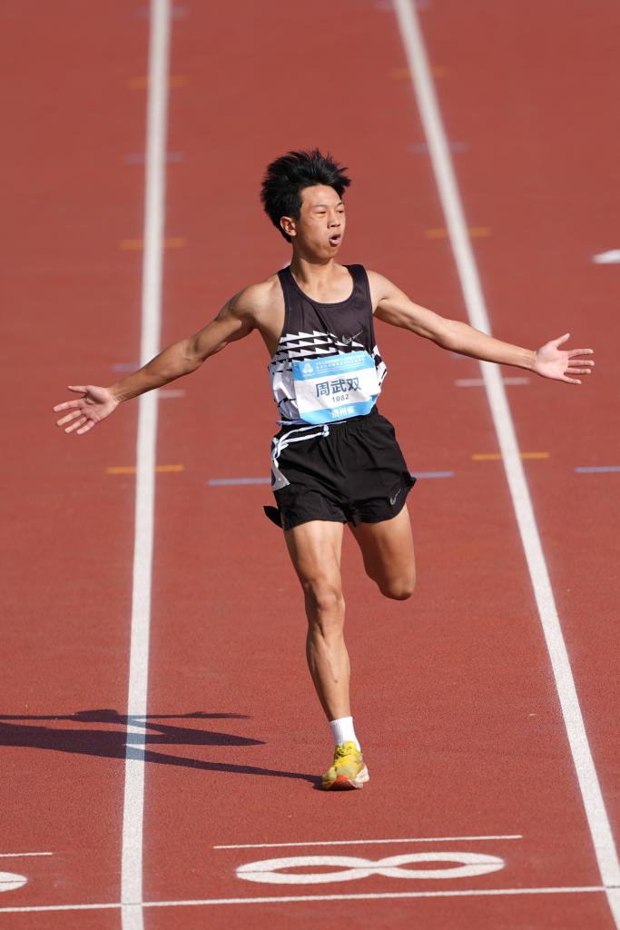 12月12日,貴州隊選手周武雙在男子12-15歲組400米預賽第4組比賽中,即將沖過終點時慶祝。新華社記者 楊晨光 攝
