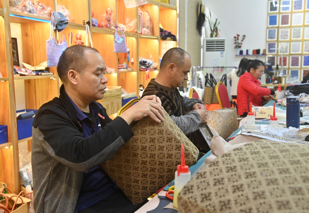 在廣西賓陽壯錦文創(chuàng)館,工人制作壯錦文創(chuàng)產(chǎn)品。廣西賓陽縣有著悠久的壯錦生產(chǎn)歷史。近年來,該縣在傳統(tǒng)壯錦生產(chǎn)的基礎上,積極推動壯錦文創(chuàng)產(chǎn)業(yè)發(fā)展,拓寬了當?shù)貏趧泳蜆I(yè)渠道。新華社記者 陸波岸 攝