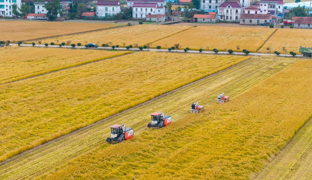 2025年10月30日,在江蘇省南通市通州區(qū)十總鎮(zhèn)育民村高標準農田里,村民駕駛農機收割水稻(無人機照片)。新華社發(fā)(翟慧勇攝)